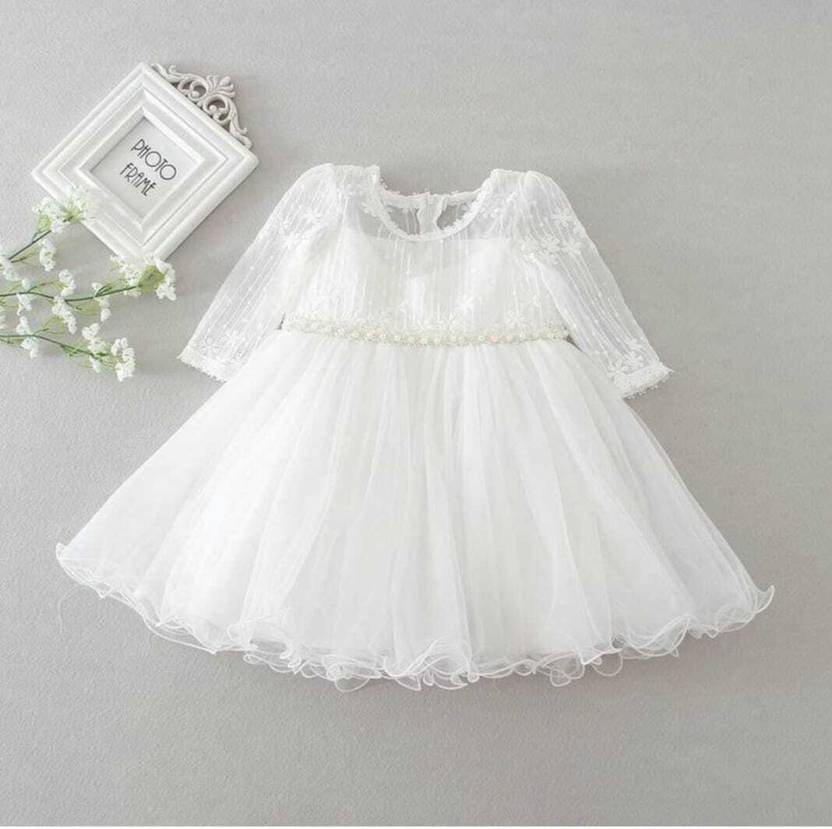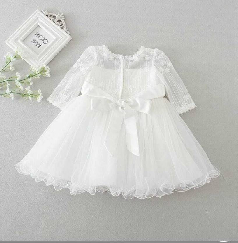 The soothing **white color** symbolizes purity and innocence, beautifully complementing the gentle detailing and soft texture of the fabric. Lightweight yet luxurious, this dress ensures your baby feels as special as she looks.