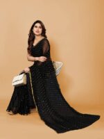 Drape yourself in timeless elegance with this Embellished, Printed Bollywood Chiffon Saree in stunning Black and Gold — perfect for festive occasions and celebrations.