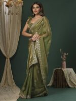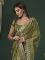 The subtle **light green hue** exudes freshness and grace, while the **delicate embroidery detailing** on the border and pallu adds a regal touch, making it ideal for weddings, parties, or festive occasions. Its soft and lightweight fabric ensures comfort throughout the day, while maintaining a polished, refined appearance.